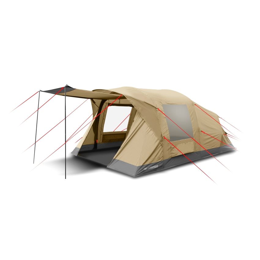 Внутреннее пространство палатки Family Texas разделено на несколько отдельных зон. Это 2 спальни, в каждой из которых может разместиться по 2 человека, и общее пространство в передней части палатки. Его при необходимости тоже можно использовать как спальню, чтобы разместить еще 2 человек, либо сделать здесь кухню или место для хранения вещей. С задней стороны палатки есть большое окно, которое открывается снаружи. С обеих сторон передней комнаты также есть окна. Открыть их можно изнутри палатки. В модели Family Texas созданы все условия, чтобы отдыхающим всегда было достаточно света и свежего воздуха.